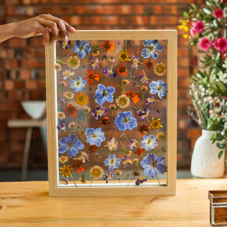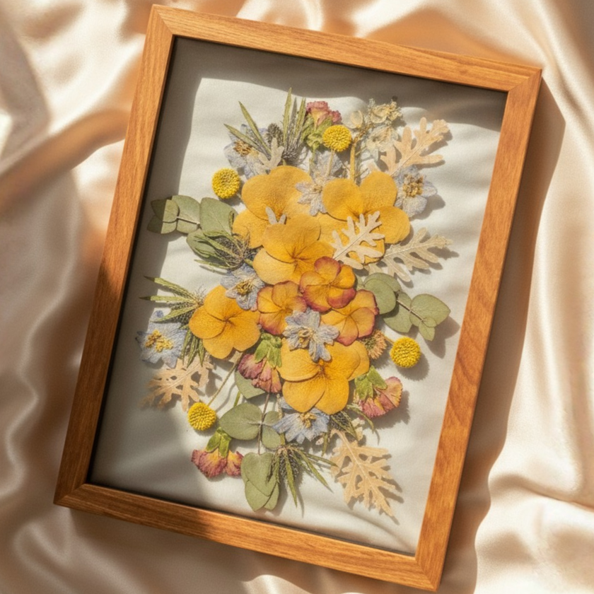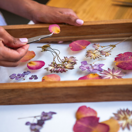 Once your flowers are gently removed from the press, they enter the design phase at our studio. Each bloom is thoughtfully arranged with attention to colour, texture, and balance to create a harmonious, timeless composition. During this stage, your flowers are also fumigated to preserve their beauty and integrity.