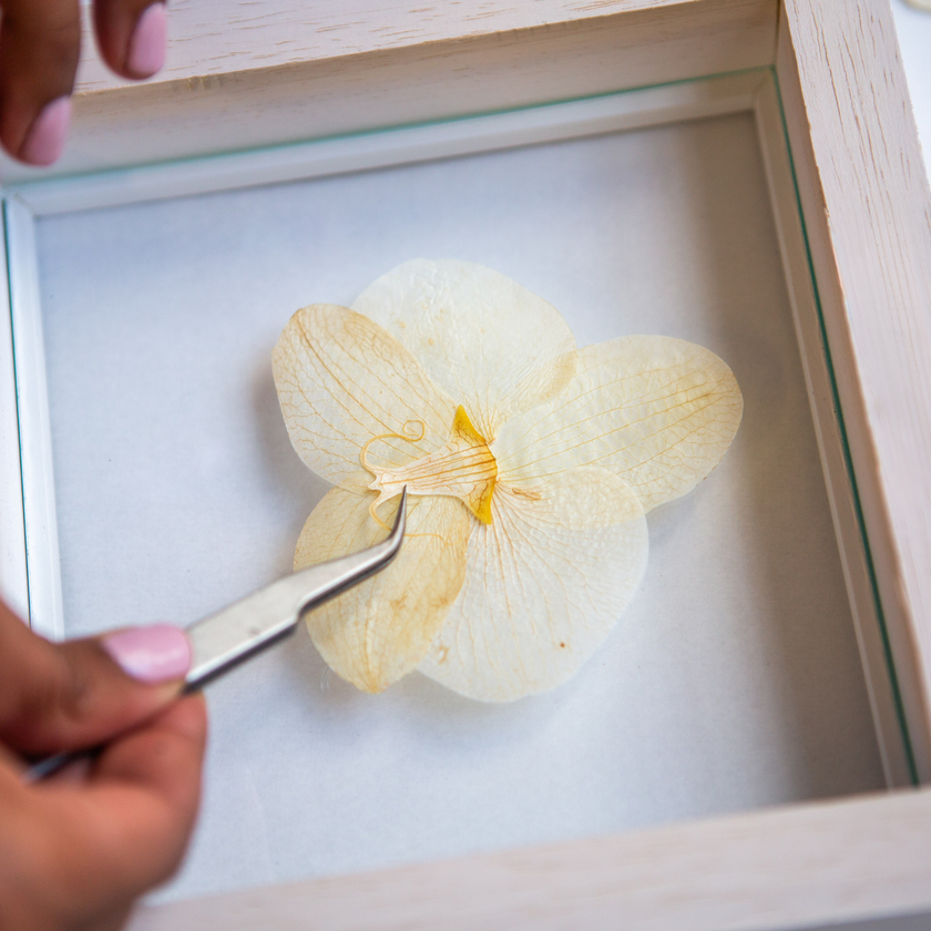 When it comes to framing, natural wood, black, kiaat, or oak frames complement white bouquets beautifully. White frames, while elegant, can sometimes feel stark against preserved blooms, so we suggest choosing carefully to suit your piece.