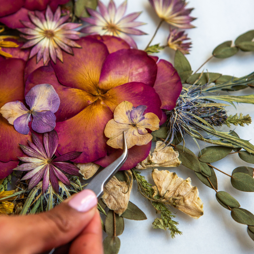 White flowers can naturally shift in tone, drying into shades of ivory, cream, soft yellows, or gentle sepia. Selecting your fresh whites with your desired preserved outcome in mind ensures your piece reflects your vision beautifully.